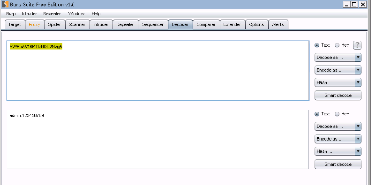 16、粘贴在decoder下,选择decode as base64,可以看到用户名密码为root:1234567890,登录。