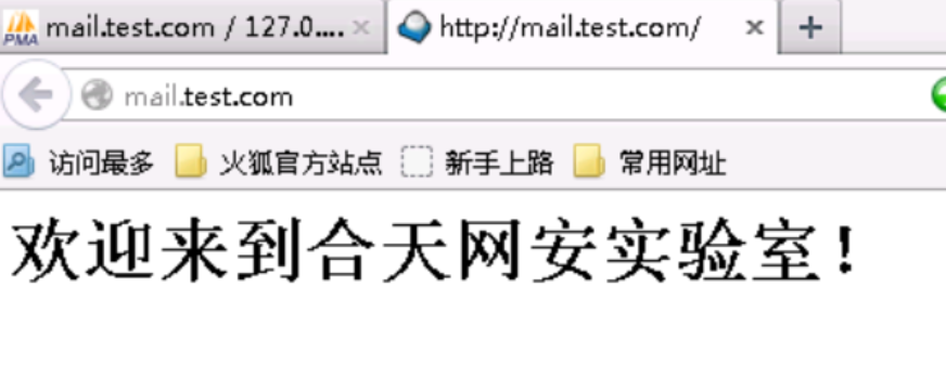 25、刷新 http://mail.test.com,发现劫持成功。页面会显示为:“欢迎来到合天网安实验室!”