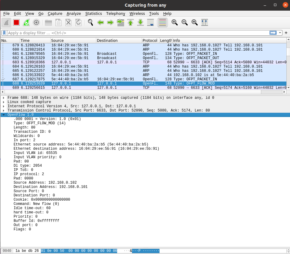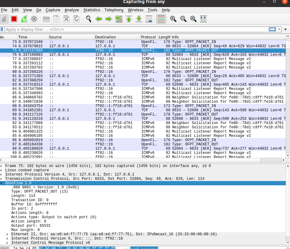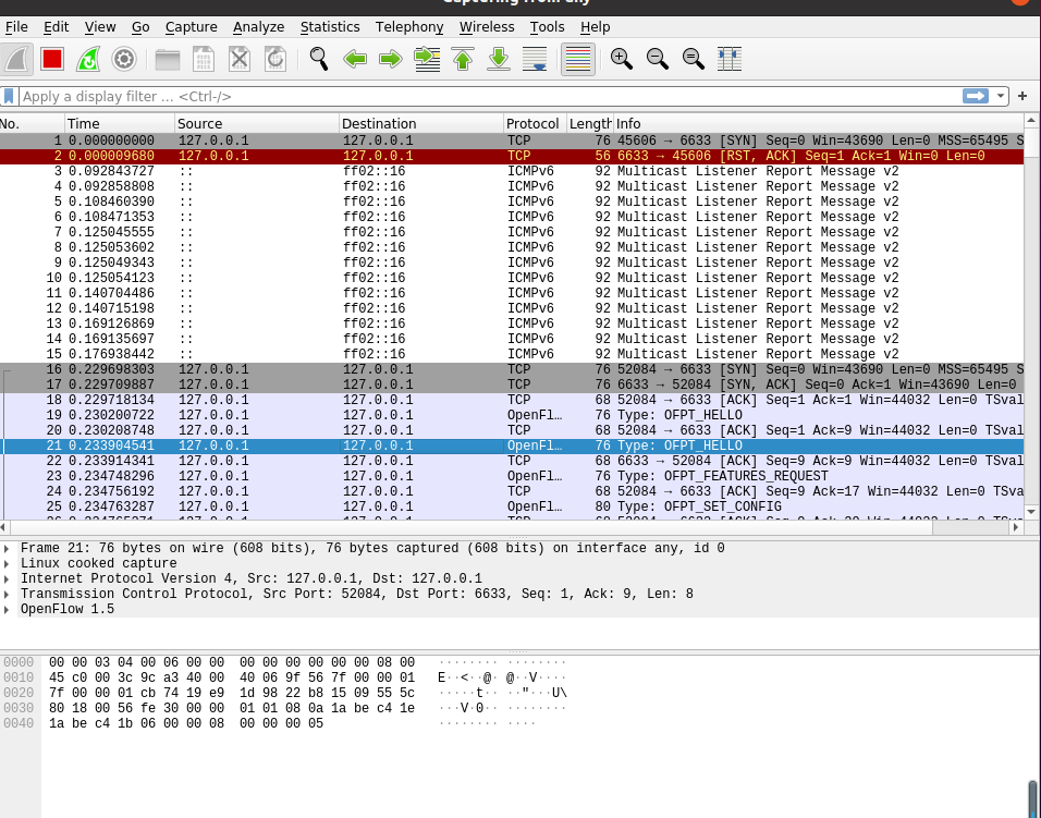 在做的过程中由于不大熟悉命令有所卡顿,这个实验主要是抓包分析OpenFlow通讯过程数据包。对wireshark工具使用更加熟练,通过抓包的结果进行观察与学习,了解OpenFlow主要消息类型对应的数据结构定义。在最开始的时候找hello包时,老是找不到(太费眼睛了),后面同学帮忙才找到,其它包就比较容易找到,然后是在进阶部分对源代码进行分析比较难,看不懂英文,就得去网上查阅。一定要做一题存稿!!!以免发生意外,就白做了,或者看看有没有自动备份。