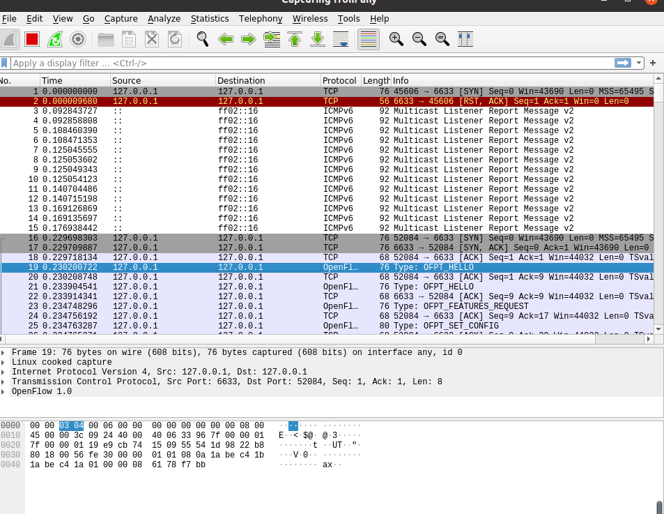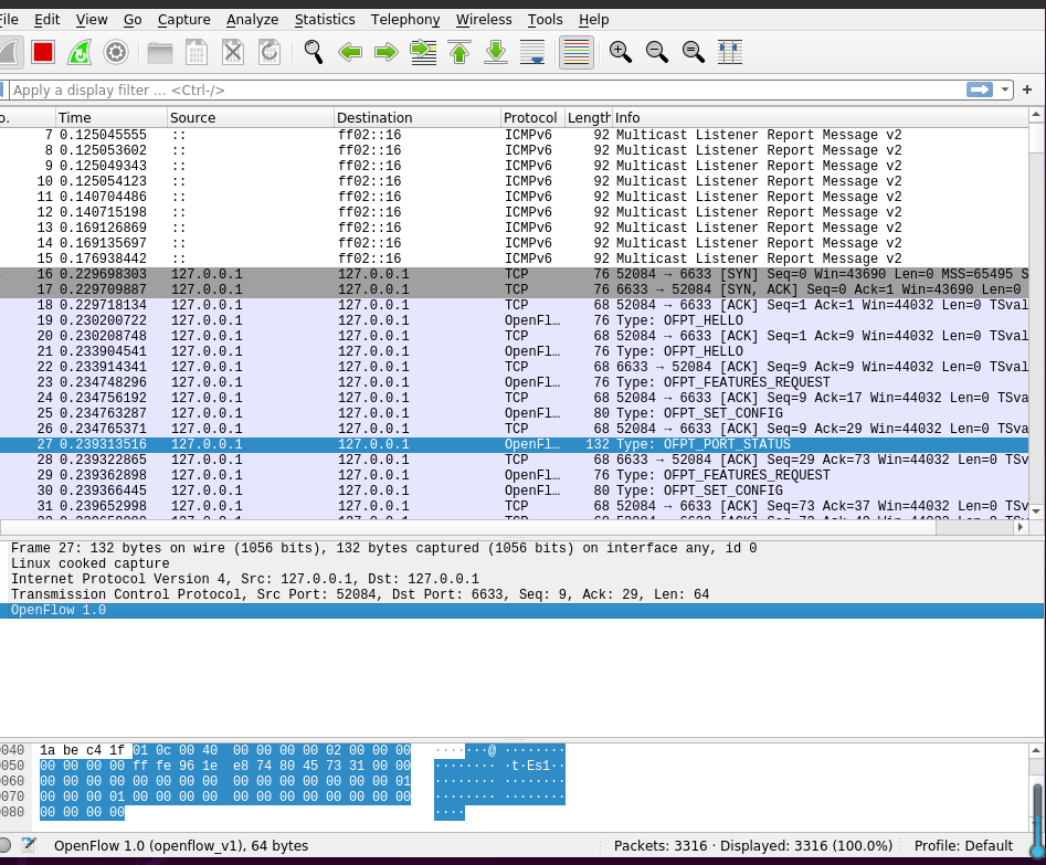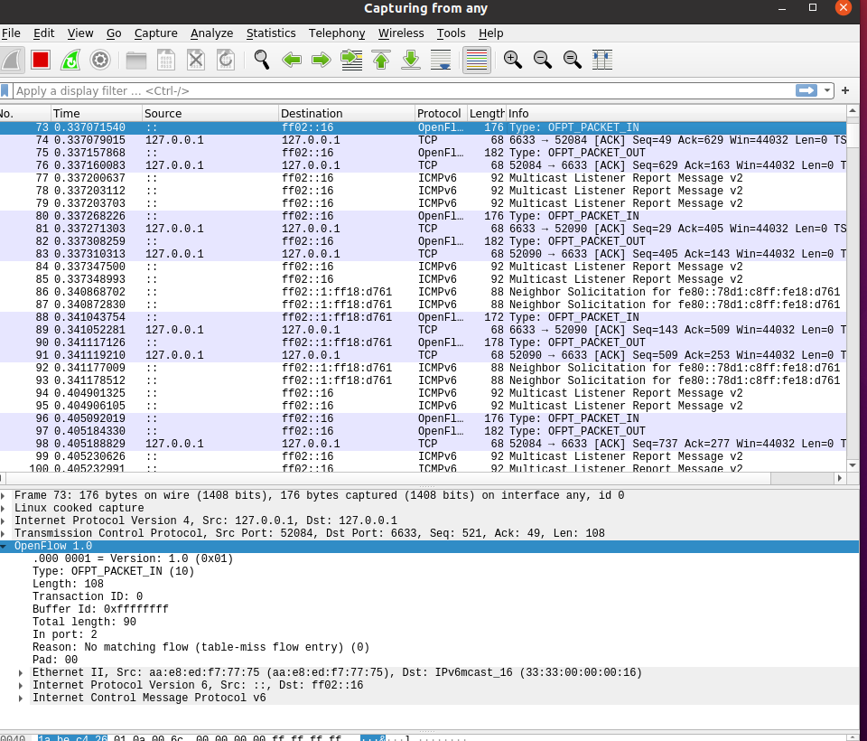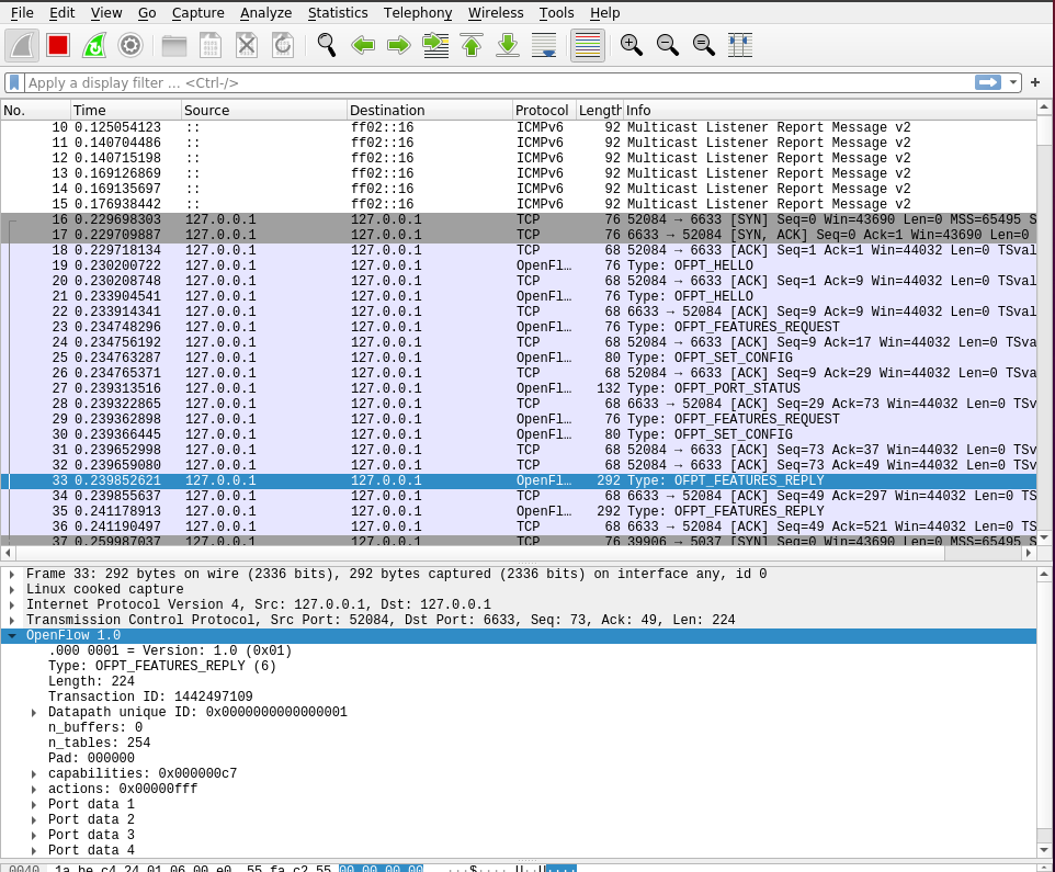 控制器6633端口(我最高能支持OpenFlow 1.0) ---> 交换机52084端口
