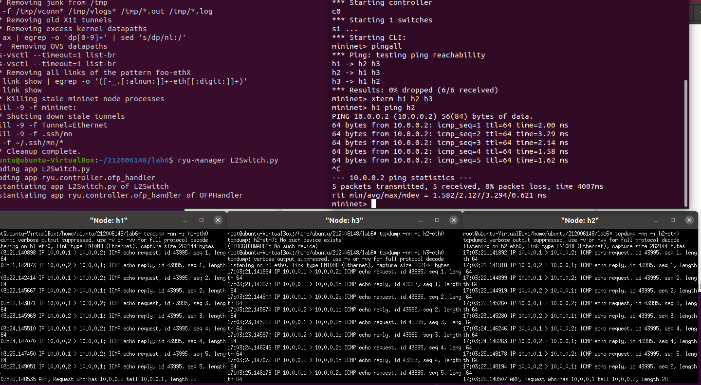 在本次实验中,能够独立部署RYU控制器,通过阅读RYU文档以及查看相关模块的源代码,进一步了解了RYU控制器的工作原理,比较了RYU的L2Switch模块与POX的Hub模块的不同之处。