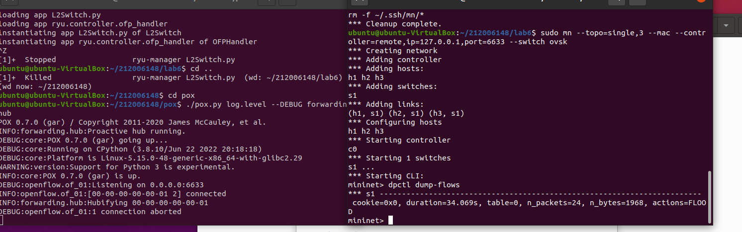 1、分析L2Switch和POX的Hub模块有何不同:L2Switch模块查看不了流表,hub模块可以查看流表