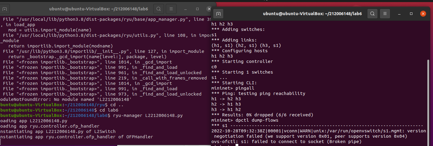 在运行L2Switch.py和L2212006148.py时一定要看清楚是在哪个文件夹在运行,要不然会运行出错。在做L2212006148.py时建立拓扑要把协议改为openflow13。