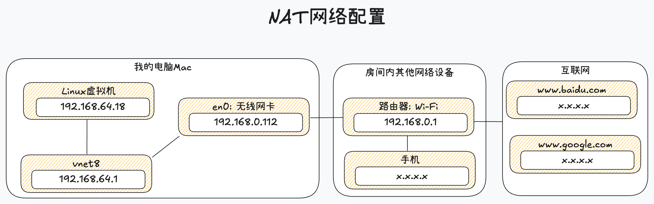 - NAT模式: 虚拟机被分配一个虚拟的私有IP地址,外部网络无法直接访问该虚拟机。虚拟机通过主机的NAT转发来访问外网,主机充当网关角色。虚拟机只能通过主机访问外网,不能直接访问局域网中的其他设备。不会引起ip冲突