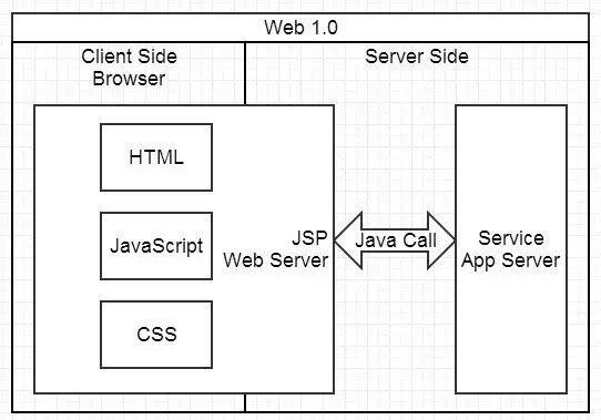 可称之为 Web 1.0 时代,非常适合创业型小项目,不分前后端,经常 3-5 人搞定所有开发。页面由 JSP、PHP 等工程师在服务端生成,浏览器负责展现。基本上是服务端给什么浏览器就展现什么,展现的控制在 Web Server 层。