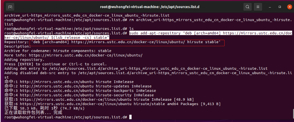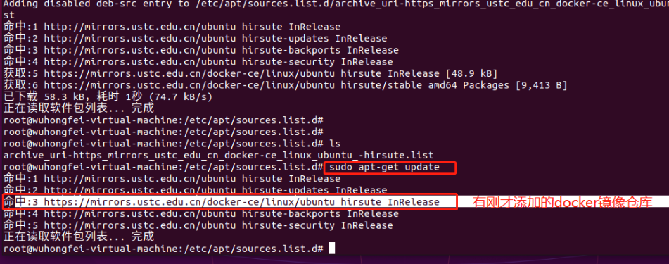 - 再次更新 apt 包索引,可以看到前面配置的仓库镜像地址信息