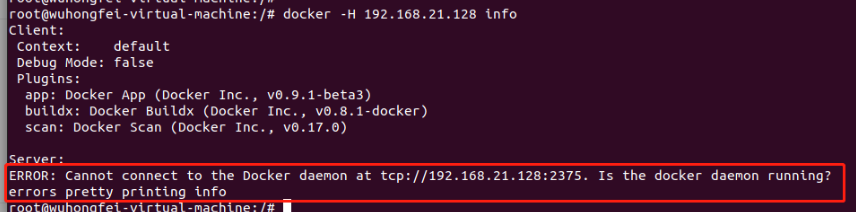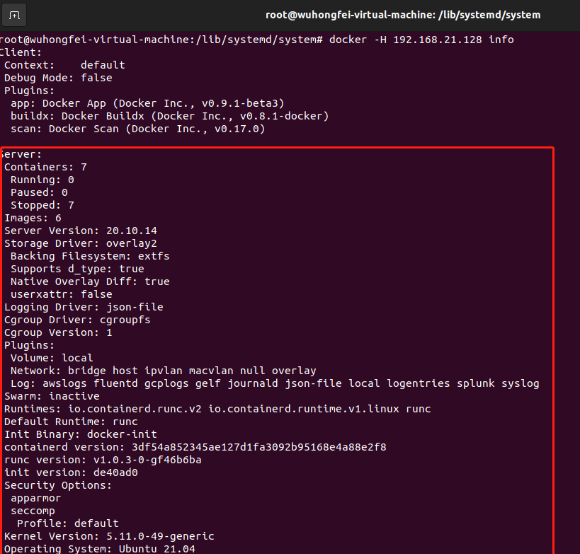 宿主机(安装docker server的电脑)上使用命令,格式为:docker -H 宿主机ip info,例如: