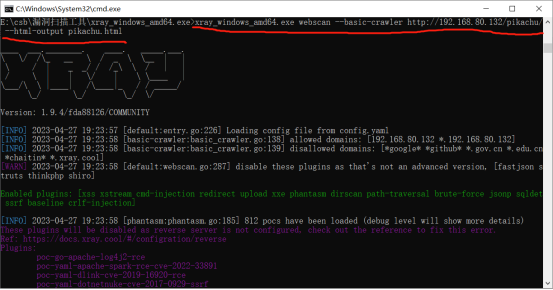 //主动扫描 xray_windows_amd64.exe webscan --basic-crawler http://127.0.0.1/pikachu/ --html-output pikachu.html //被动扫描(ip为主机ip) xray_windows_amd64.exe webscan --listen xxx.xxx.xxx.xxxIP:7777 --html-output xhcms2.html