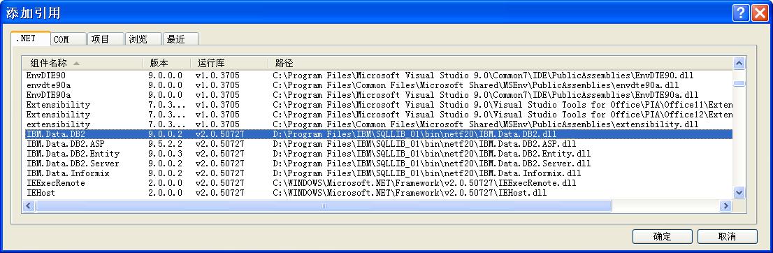 添加步骤:“引用”文件夹上点击右键,“添加引用”,“.NET选项卡”,“IBM.Data.DB2”。
