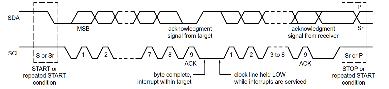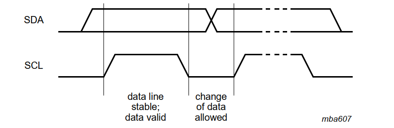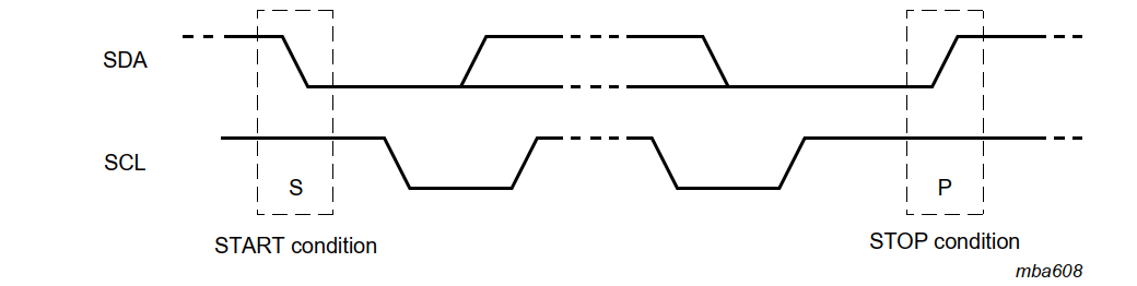 - start:由于开漏的特性,在设备不进行总线控制时,SDA和SCL均处于高电平。主机此时需要占据从总线进行传输,则拉低SDA电平,即在SCL处于高电平时进行SDA电平的转换,SDA由高电平到低电平的转换表示开始。repeat start则是指在不释放总线的情况重新发起,一般用于切换读写命令或者切换到其他从设备