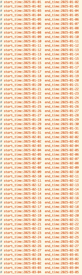 #!/bin/bash if [ -z $1 ]; then echo 'plz input start time, example: 2025-01-01' exit 1 fi start_timestamp=`date -d "$1" +%s` if [ -z $start_timestamp ]; then echo "invalid start time, input: $1" exit 1 fi end_time="$2" if [ -z $2 ]; then end_time=`date +%F` fi end_timestamp=`date -d "$end_time" +%s` dur=86400 # 步长 1 天, 可通过修改这里实现自定义步长 st=$start_timestamp et=$end_timestamp while [ $st -le $et ]; do ett=$((st+dur)) stm=`date -d@${st} +%F` etm=`date -d@${ett} +%F` # TODO: 填充代码 echo -e "# \033[31mstart_time:$stm end_time:$etm \033[0m" st=$ett done