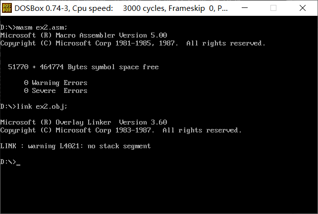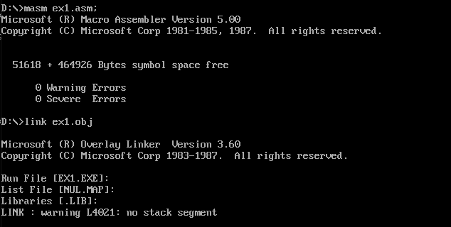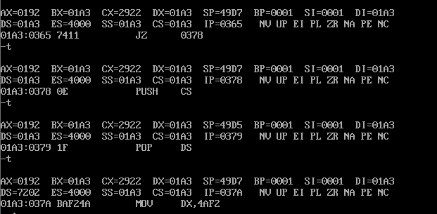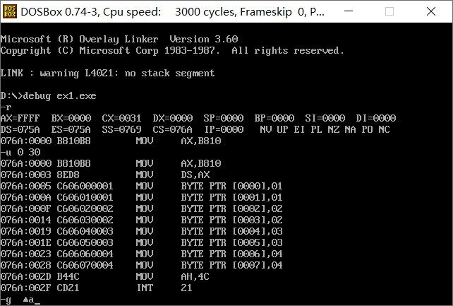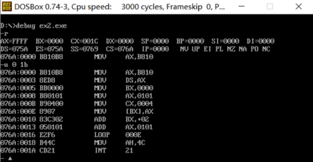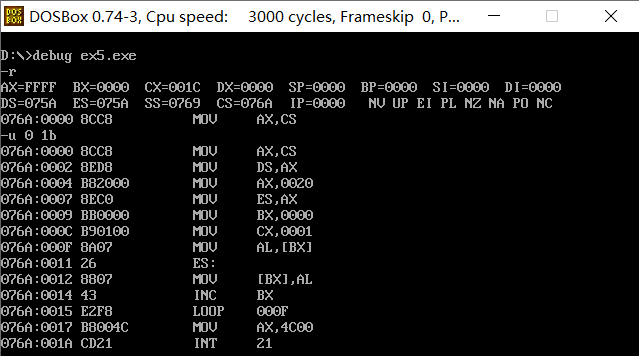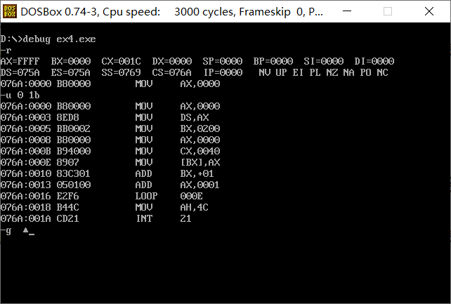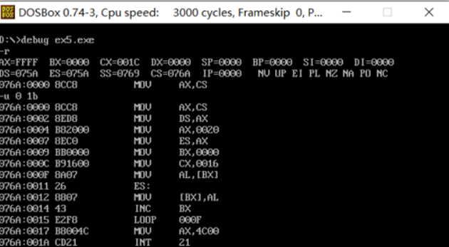 对程序进行汇编链接后debug ex4.exe,首先使用r命令查看寄存器状态并且使用u命令精确反汇编: