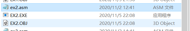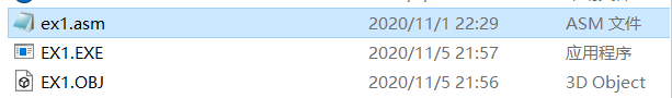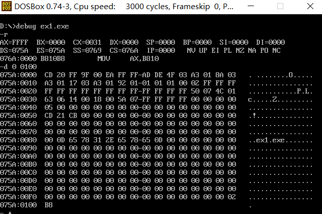使用d命令查看程序段前缀PSP,可以看到其中有ex1.exe表明程序的名称以及一些其他信息有存储在PSP中: