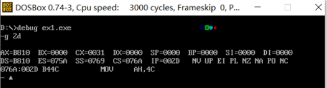 然后根据u命令得到各个指令对应的地址,然后准确执行到Mov ah,4c前,可以看到dosbox窗口右上角出现图案,程序成功实现功能,修改显存内容: