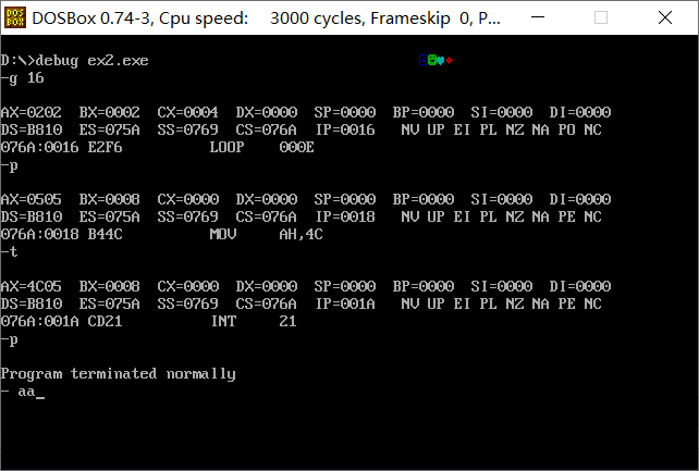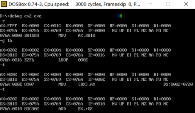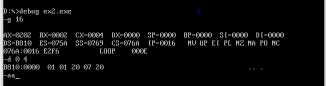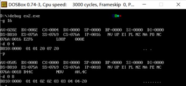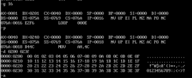 根据u命令反汇编得到loop指令在偏移地址为0016H的地址,因此使用g命令执行到loop命令前,若执行超过则可能会崩溃,并且使用d命令查看此次操作成功修改了第一处内存单元,右上角显示了一个图案: