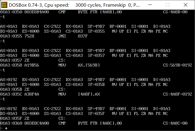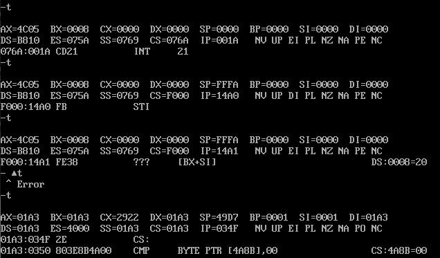 然后先使用t命令执行INT21指令,可以看到程序同样进入INT 21内部执行每一条指令,需要执行很多条指令程序才能成功正确执行: