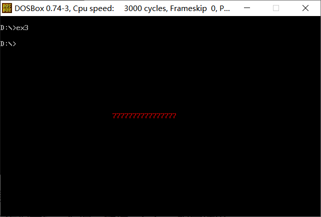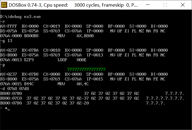 进行汇编链接后debug,可以看到屏幕中央出现16个绿色问号符合预期效果,同时使用d命令可以查看到对应显存已被成功修改: