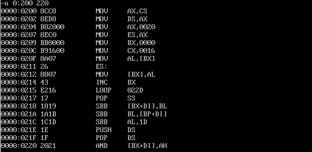 使用u命令对0:200 220的内容进行反汇编,可以看到刚好在0000:0217H开始是程序的无关内容,说明成功存入: