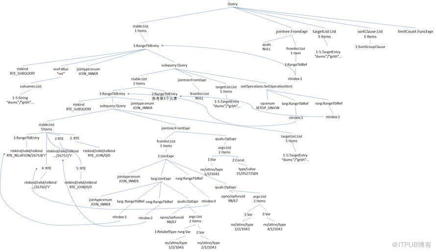 jointree -->连接树,查询的连接树显示了FROM子句中表的连接情况。对于类似于SELECT...FROM a,b,c的简单查询,连接树只是FROM中表的简单列表,因为允许以任意顺序连接这些表。如果使用JOIN表达式(尤其是外连接),必须按照该连接指定的顺序进行连接。此时,连接树显示了JOIN表达式的结构。JOIN子句上的约束条件(ON或USING表达式)作为附加在连接树节点上的条件表达式处理。通常,还会把顶层WHERE表达式作为附加在顶层连接树节点上的条件表达式来处理,因此,连接树实际上表示了SELECT语句中的FROM和WHERE子句。