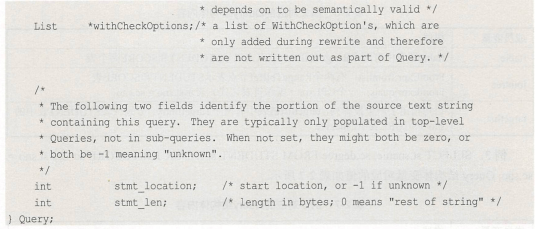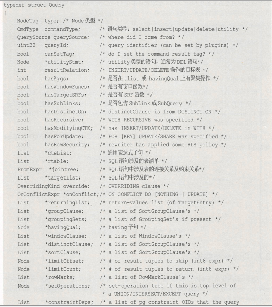 1 typedef struct Query{ 2 NodeTag type; 3 CmdType commandType; // select | insert | update | delete | utility 4 QuerySource querySource; // where did I come from? 5 ...... 6 } Query;
