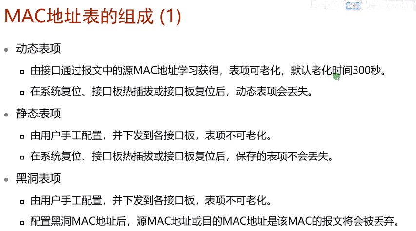 sw在接收到每一个数据帧的时候,都会进行源mac地址的学习。如果端口被shutdown或者网线拔掉,则从这个端口上学到的mac地址会被立即删掉,不需要等待300s的老化时间(//类似于路由,已无效)