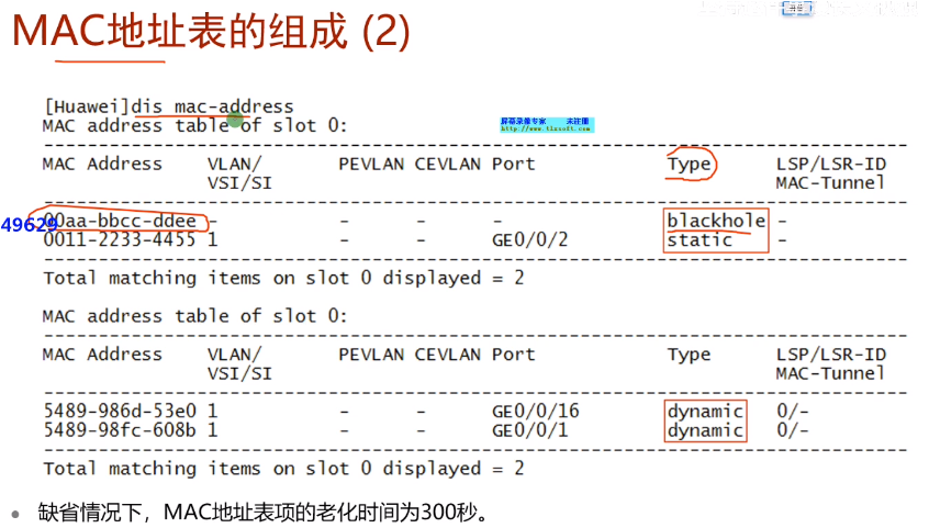 mac地址表的组成:mac地址,vlan,type,vsi、port