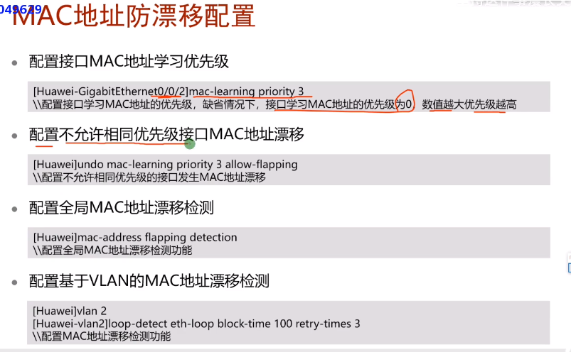 ex:在没有环路的情况下,有攻击的行为, 有攻击者冒充服务器频繁向sw发送数据,那么服务器的mac地址将不能被sw学习到,此时如果有主机想去访问服务器,则sw会将流量引到攻击者上。在这里就可以配置端口mac地址学习的优先级