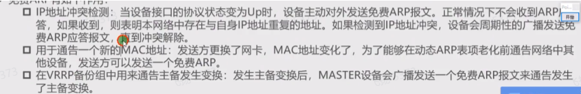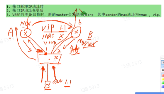 当主机向虚拟网关1.1发起arp请求时,master会进行arp的应答,然后sw就会从1口学到x的mac地址。而在vrrp主备切换之后,b成为master之后会主动发送免费arp(//本质是一种arp请求,不应该收到arp应答