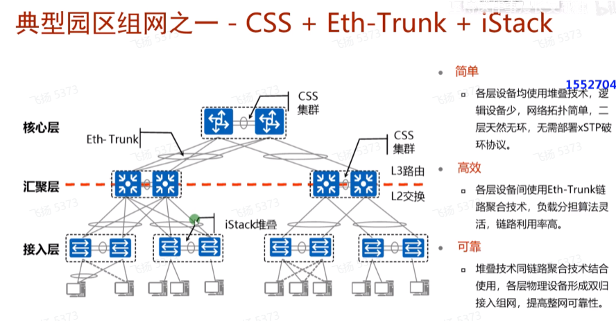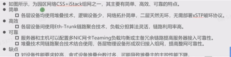 上图这种就不需要跑vrrp+mstp这种结构 (通过虚拟化技术,将园区组网从(STP+VRRP+Eth-Trunk+BFD+路由协议)变成了(CSS + Eth-Trunk + iStack)模式//本质就是用css/istack来代替vrrp+bfd),业务网关可以直接部署在汇聚层,配置vlanif。当一台设备挂了,另一台设备还可以充当网关继续使用,因为这俩设备就是堆叠。