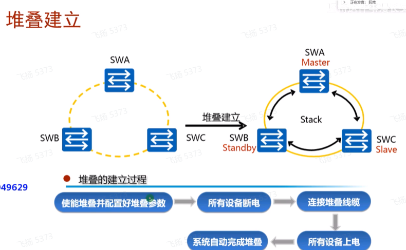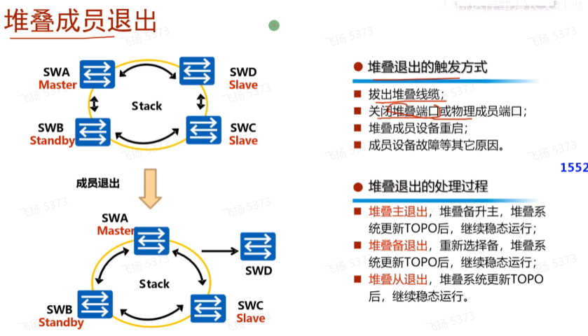 堆叠端口是一个逻辑接口,就跟eth一样。上图为环形堆叠,swc两端连接全断了,c才会退出堆叠。另一种堆叠方式为链型堆叠。环形的堆叠系统可靠性更高,不容易分裂。链型堆叠,中间down了,就会形成两套堆叠系统-脑裂,产生配置冲突。