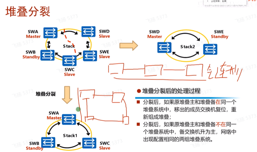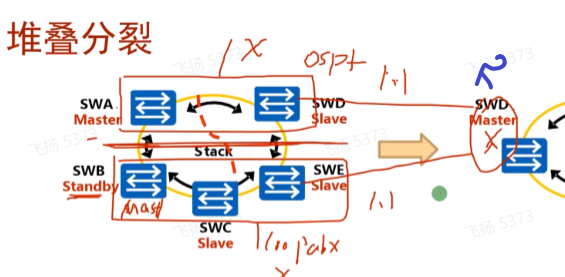 堆叠分裂(又称为脑裂)的影响:master和standby从上图中间断开,会组成两套堆叠系统,由于两个堆叠系统的配置是一样的,如果之前都有一个loop接口,地址是x,运行ospf,然后下面也会出现一个loop,x。因为配置是一样的,那假如右侧上联是一台router的话,则router到达x的路由流量就会负载分担(因为两个堆叠的配置是一样的),造成网络的震荡。主要是看分裂后主和备是否在同一个堆叠里