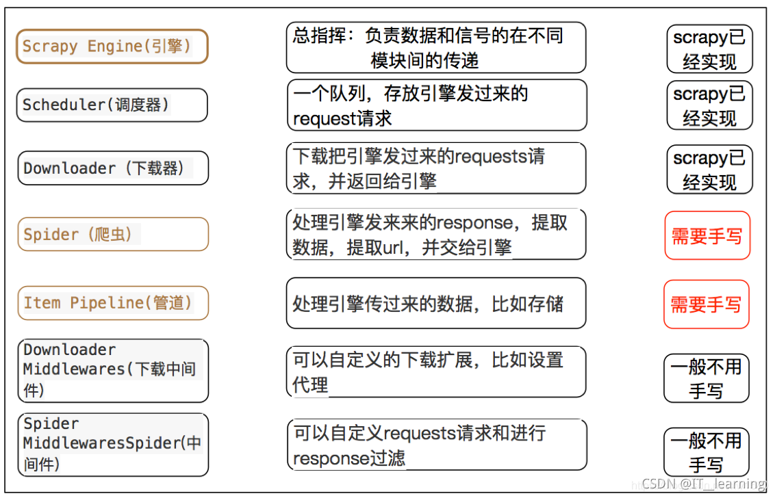 4、自定义中间件:1)下载器中间件:用于自动更换user-agent、IP; 2)爬虫中间件:用于处理输入(response)和输出(items或requests);