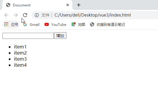 Vue.createApp({ data() { return { list: ['item1', 'item2', 'item3', 'item4'], inputVal: "" } }, methods: { handleAddItem() { this.list.push(this.inputVal) this.inputVal = '' } }, template: ` <div> <input v-model="inputVal" /> // v-bind可以实现将data中的数据绑定在指定属性上,包括html原生标签属性和后续组件传值 // v-bind:title="inputVal"可以简写成:title="inputVal" <button v-bind:title="inputVal" v-on:click="handleAddItem">增加{{ inputVal }}</button> <ul> // {{}} 叫做差值表达式,可以实现与data中的数据动态绑定, // 可以实现【把文本框的内容实时的显示在按钮里面】 <li v-for="(item,index) of list">{{item}}</li> </ul> </div> ` }).mount('#root')