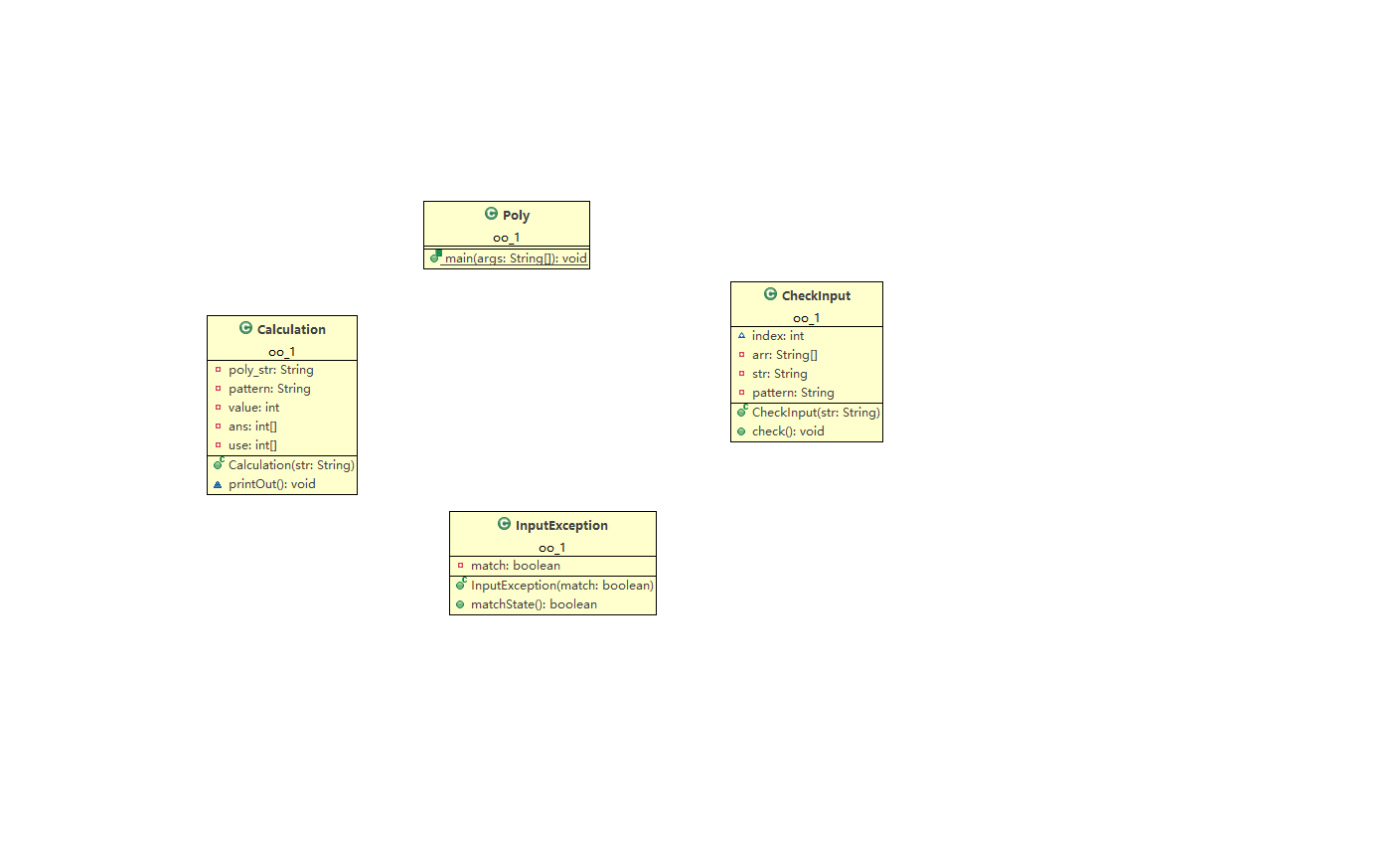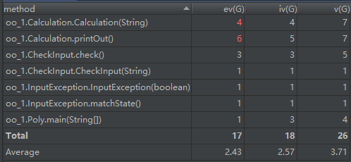 我在oo_1.Calculation类的构造方法Calculaiton(String)进行了多项式的计算。具体包括将每个多项式的(c,n)以及多项式前的+/-号提取出来,然后进行累加(减)。现在看来,在构造方法里进行计算不仅代码逻辑较为复杂,而且有些难以理解。如果要修改的话,我会在构造方法里仅仅进行存入这个String值的操作,然后将计算剥离至新建的方法中。oo_1.Calculaiton.printOut()执行打印相应结果的操作,之所以被标红,个人觉得不是因为复杂度高,而是由于if/else分支嵌套较多,导致代码逻辑显得复杂,实际上用人的思维去理解会发现并不复杂(Lol)。