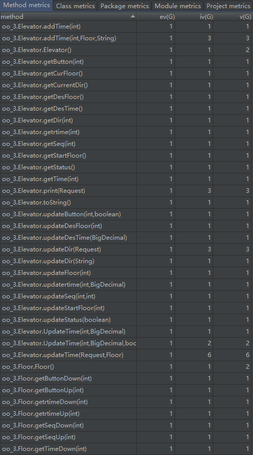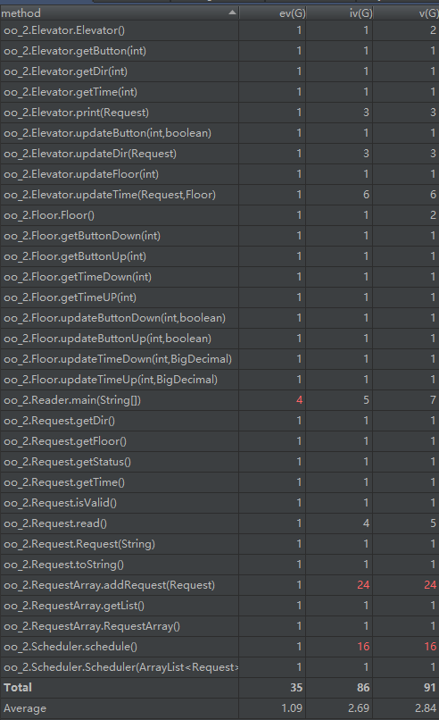 oo_2.Reader.main(String[])的ev(G)被标为红色,个人觉得是因为在代码里使用了while(true)来读入电梯指令(存疑); oo_2.RequestArray.addRequest(Request)的iv(G)和(G)都被标为了红色。这个方法的功能是将传进来的Request对象进行再次判断,符合要求的存进请求队列里。现在来看,我对于判断请求是否正确而做的工作明显繁冗,因为我在两个方法里进行了两次判断,只有符合这两次判断的才能被成功添加进请求队列。我将这一个功能分裂在了两个方法里,而实际上放在一个方法里,会使代码耦合性更低,更利于维护。oo_2.Scheduler.schedule()方法标红,我想是因为我将Scheduler类的所有功能集中在了这一个方法里,即这个方法完成了判断同质、调度电梯运动等功能。这个方法所包含的功能太杂,不单一。不利于修改和继承,导致我第三次作业直接完全重写了这个方法。