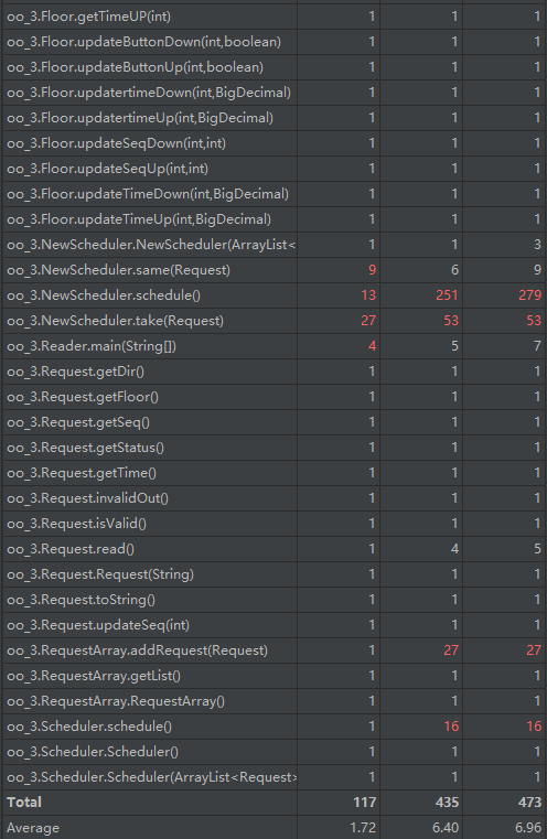 虽然说看起来ALS电梯只是增加了捎带功能,实际上代码的复杂度较之上次大了不少(也可能是我把问题想复杂了?)oo_3.NewScheduler.same(Request)用于判断Requset类的请求是否同质。我这个方法的ev(G)标红,应该是因为if/else分支过多导致。oo_3.NewScheduler.shedule()和oo_3.NewScheduler.take()方法三路全崩,损失惨重。这两个方法首先代码极长,其次if/else分支多,进行的功能杂。take()方法在判断能否捎带之余还负责更新了下电梯被捎带指令时间,这个功能不应在此"顺带完成"。而且由于这个顺带操作,我在debug时引入了新的bug,以至于一时半会儿都找不到彻底解决bug的方法。schedule()的代码量长的一大原因是出现了极多的if/else,而每个分支内代码内容又相似,以至于出现了极多的复制粘贴。代码量太长,这导致我在debug时出现了许多困难。其余标红的地方和第二次实验的原因相同(因为功能几乎一样就直接把上次的复制了过来,做了一点点修改而已)。