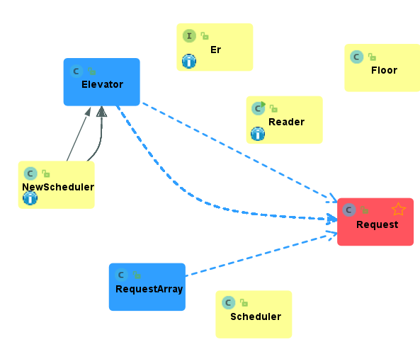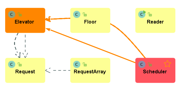 Floor类在本次实验中作用很小,仅仅存储了楼层指令的到达时间。Reader类则是进行读入,在main方法中实例化各个类,然后逻辑运行,得到结果。Request类负责接收Reader里读入的每一行字符串,随后进行正则表达式的匹配,如果匹配失败,则打印相关信息,匹配成功的话就加入到RequestArray类的请求队列里。电梯的相关运动状态由Elevator类负责存储和执行更新,由Scheduler类调度电梯的全局运动以及相应的信息更新(时间等)。