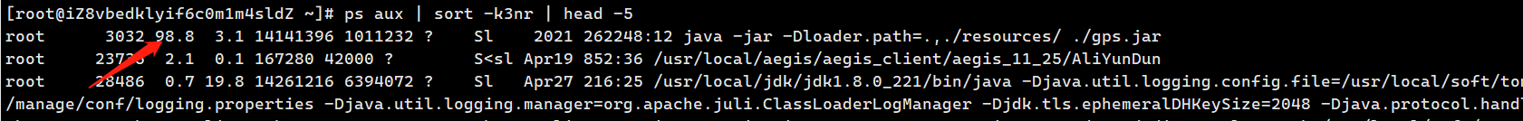 第一步:ps aux | sort -k3nr | head -5 查询前五cpu占比的进程