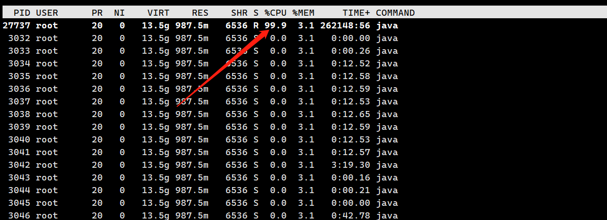 可以看到27737这个线程占用99.9%,将线程10进制转化为16进制