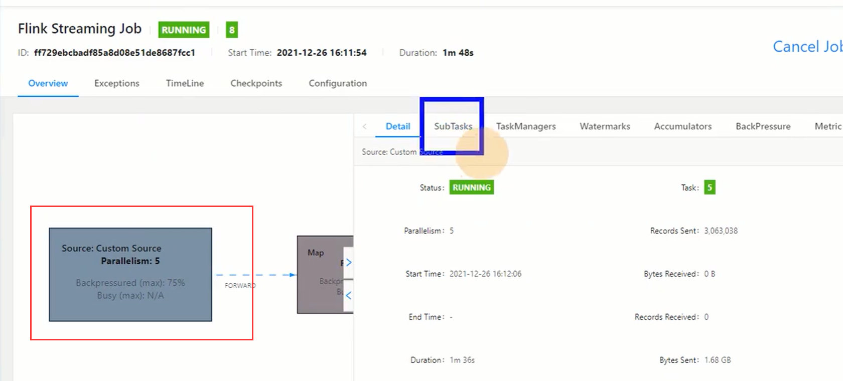 点击subtask,因为并行度是5,可以看到5个task(ID为0-4)的数据接收量和发送量(流量大小和条数),因为是source端,所以接收都是0 。