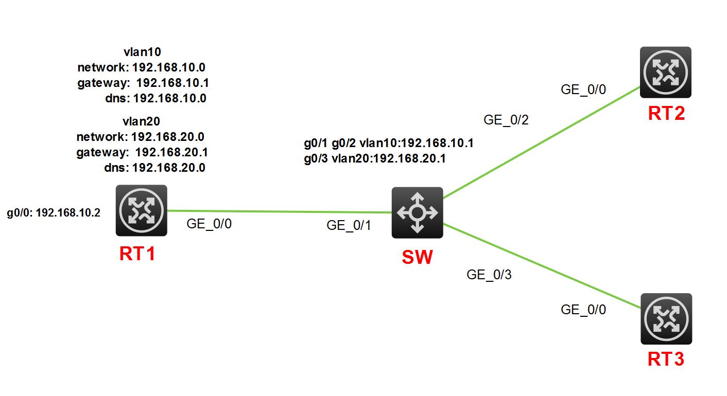 #vlan10 接入 g1/0/1 vlan20 接入 g1/0/2 vlan30 接入 g1/0/3