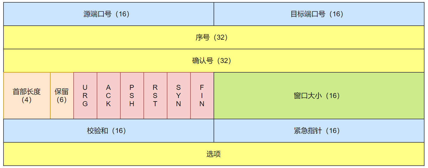(4)首部长度:表示TCP报文段的首部长度,共4位,由于TCP首部包含一个长度可变的选项部分,需要指定这个TCP报文段到底有多长。它指出 TCP 报文段的数据起始处距离 TCP 报文段的起始处有多远。该字段的单位是32位(即4个字节为计算单位),4位二进制最大表示15,所以数据偏移也就是TCP首部最大60字节。