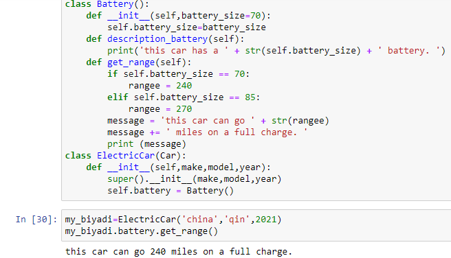 现在我们想多详细地描述电瓶都可以,且不会导致ElectricCar类混乱不堪。下面再给Battery类添加一个方法,它根据电瓶容量报告汽车的续航里程: