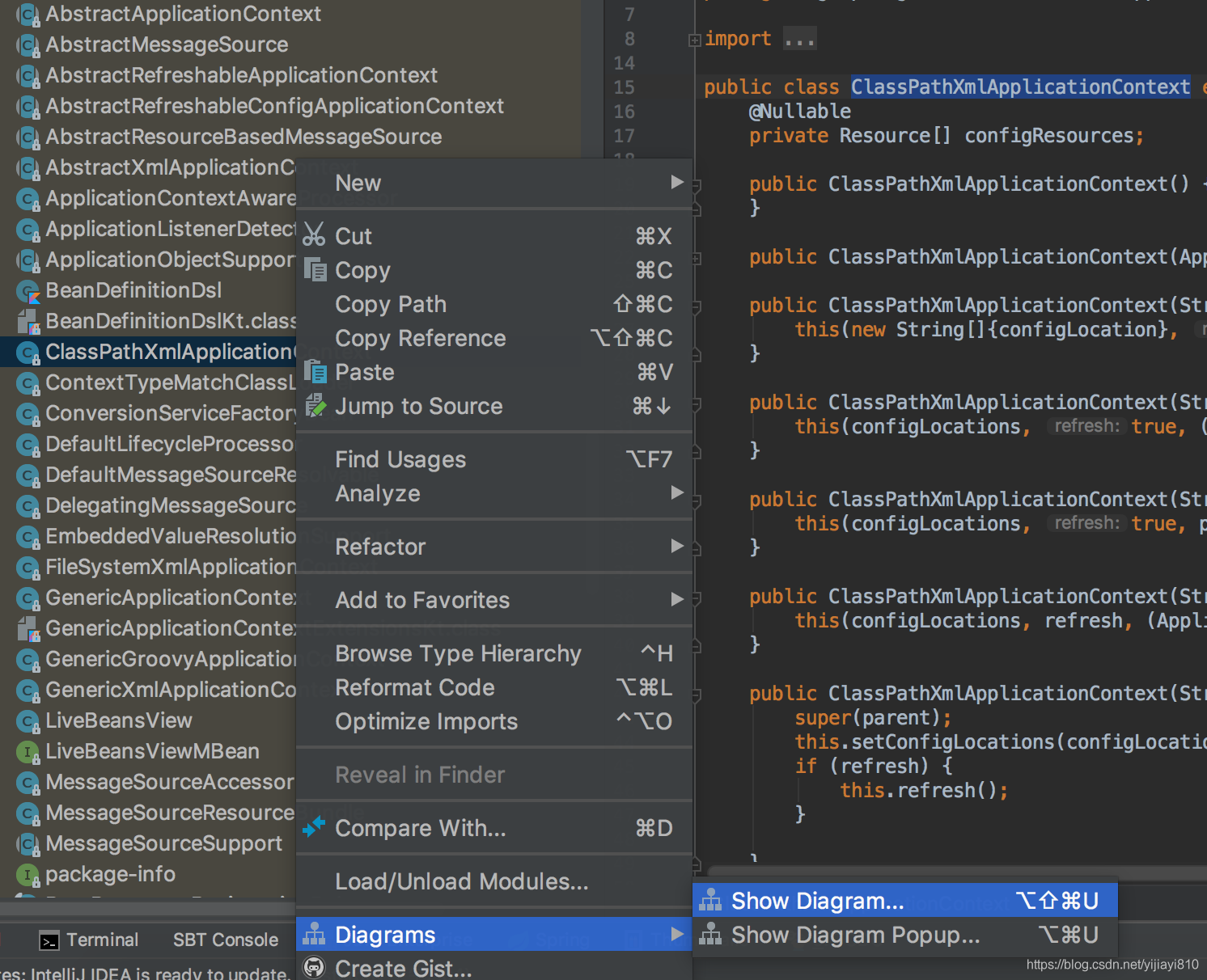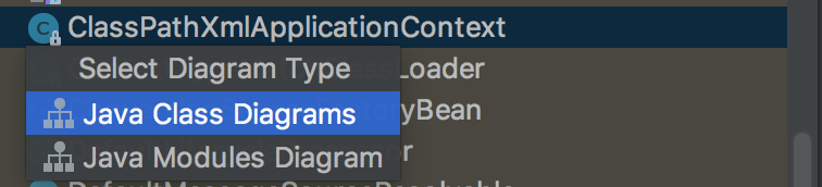 1、找到当前类所在的位置,右键选择Diagrams,然后选择Show Diagrams……,以spring的ClassPathXmlApplicationContext类为例: