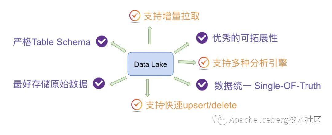 我们可以把上述三个项目针对的痛点,放到一张图上来看。可以发现标红的功能点,基本上是一个好的数据湖方案应该去做到的功能点: