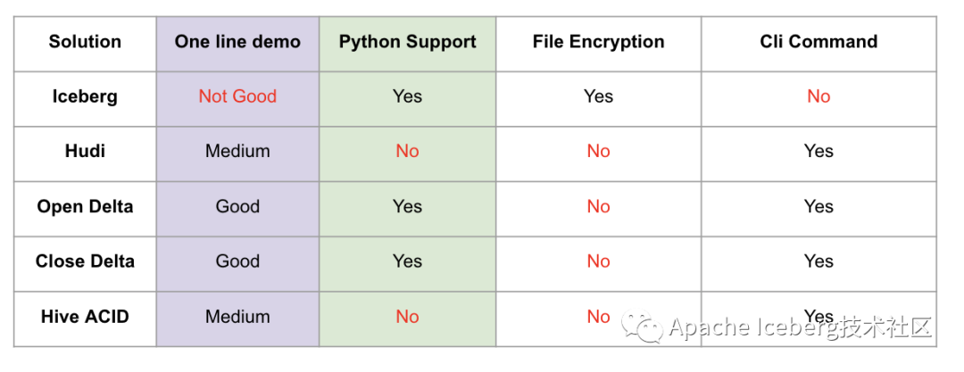 这里One line demo指的是,示例demo是否足够简单,体现了方案的易用性,Iceberg稍微复杂一点(我认为主要是Iceberg自己抽象出了schema,所以操作前需要定义好表的schema)。做得最好的其实是delta,因为它深度跟随spark易用性的脚步。
