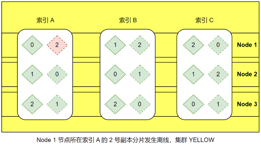 YELLOW:主分片可用,但是副本分片不可用。这种情况 Elasticsearch 集群所有的主分片已经分配了,但至少还有一个副本是未分配的。不会有数据丢失,所以搜索结果依然是完整的。不过,集群高可用性在某种程度上会被弱化。可以把 yellow 想象成一个需要关注的 warnning,该情况不影响索引读写,一般会自动恢复。