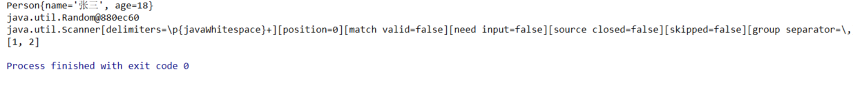1 package Demo008; 2 3 import java.util.ArrayList; 4 import java.util.Random; 5 import java.util.Scanner; 6 7 public class Demo01ToString { 8 9 10 public static void main(String[] args) { 11 Person p = new Person("张三", 18); 12 String s = p.toString(); 13 System.out.println(s); 14 15 16 Random r = new Random();//java.util.Random@880ec60 没有重写了toString方法, 17 System.out.println(r); 18 19 Scanner sc = new Scanner(System.in);//java.util.Scanner[delimiters=\p{javaWhitespace}+... 重写了toString方法, 20 System.out.println(sc); 21 22 ArrayList<Integer> list = new ArrayList<>();//[1, 2] 重写了toString方法, 23 list.add(1); 24 list.add(2); 25 System.out.println(list); 26 27 } 28 }