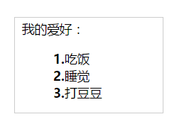 /*HTML*/<p>我的爱好:</p><ul> <li>吃饭</li> <li>睡觉</li> <li>打豆豆</li></ul> |