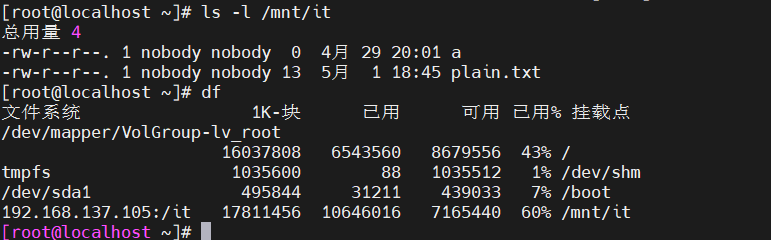 mount -t nfs 192.168.137.105:/it /mnt/it
